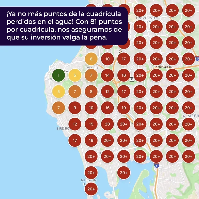 Obtén una representación visual clara de tu rendimiento en la búsqueda local. Nuestros informes de mapas de calor muestran exactamente dónde te posicionas en diferentes ubicaciones, ayudándote a rastrear el progreso e identificar oportunidades.